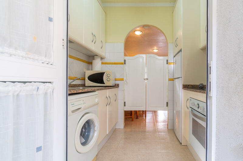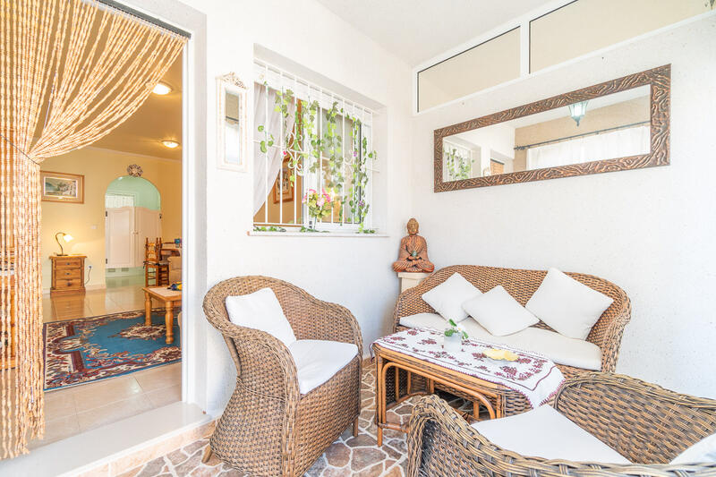 This beautiful bungalow has a beautiful spacious veranda in the front with a sitting area. Adjacent lies an open west-facing terrace. Inside we find a spacious living room with dining area and a separate fitted kitchen with a enclosed patio used as a utility room, 2 bedrooms and a family bathroom.Is sold furnished. A/C. Private parking space within the complex.