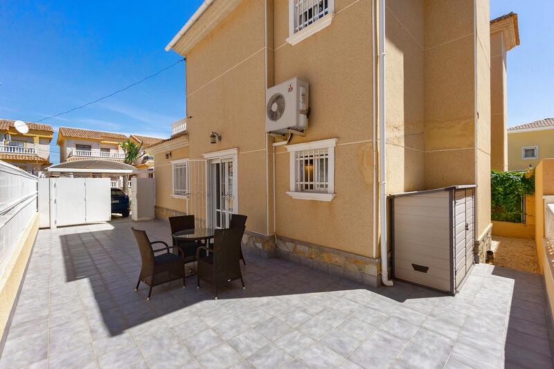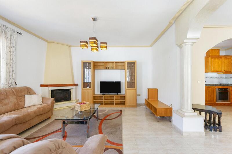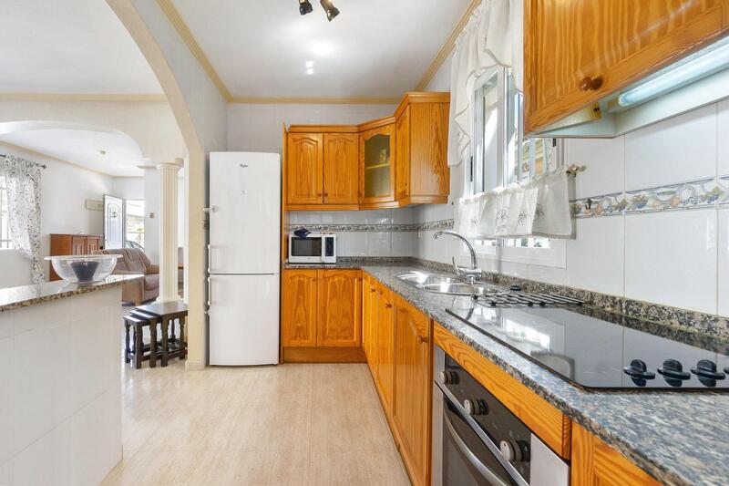 This detached villa stands on a plot of 219m². The villa has 2 bedrooms with fitted wardrobes, an American kitchen with utility room, a spacious living room with fireplace and dining area and two bathrooms, 1 of which is on the ground floor. Sold furnished.