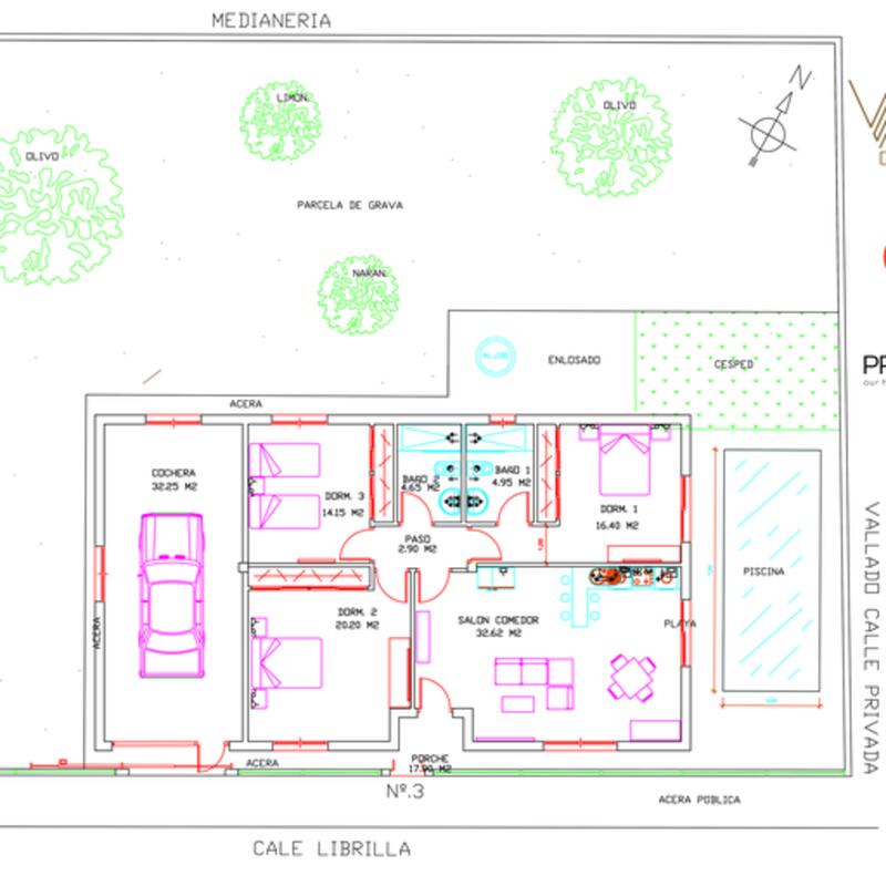 Plot paved in perimeter area and swimming pool area, area with artificial grass and stones. The rest with native trees.