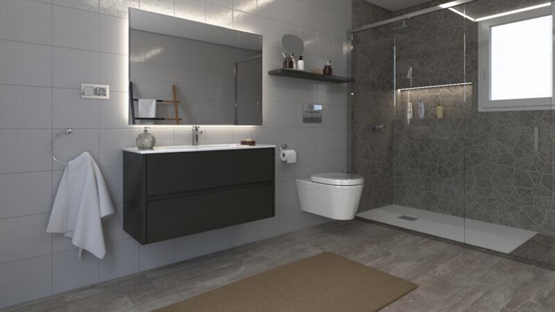 Stoneware flooring throughout the house with 60x60 format, including terraces. Different formats and choices. Bathrooms tiled in white with shower panel to choose, bathroom furniture included. Mirror and light above the washbasin.