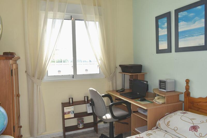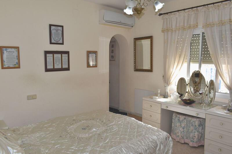 Beautiful South facing villa for sale with elevated views towards the Mediterranean sea. Located in El Presidente, Villamartin this property sits on a 420m2 plot boasting a saltwater swimming pool, summer kitchen and bbq area, numerous dining and seating areas along with a solarium. The property is accessed via the conservatory which has pretty views across the garden and swimming pool. There is a large living room, independent and fully equipped kitchen which leads into a separate utility and storage room. There is the master bedroom and en-suite bathroom, a family bathroom and 2 more bedrooms. Outside, overlooking the pool is a wooden annex and guest room with an extra bedroom and bathroom. There is a garage providing secure off road parking along with a tool shed. This villa is sold fully furnished with many extras including heated swimming pool, new kitchen appliances, air-conditioning and even a car!