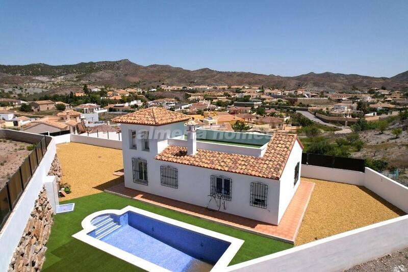 Detached three bedroom villa with a feature tower and a well sized roof terrace for sale in the Arboleas area. With a build size of 119m2, the villa is set in the middle of a flat walled plot of 600m2.