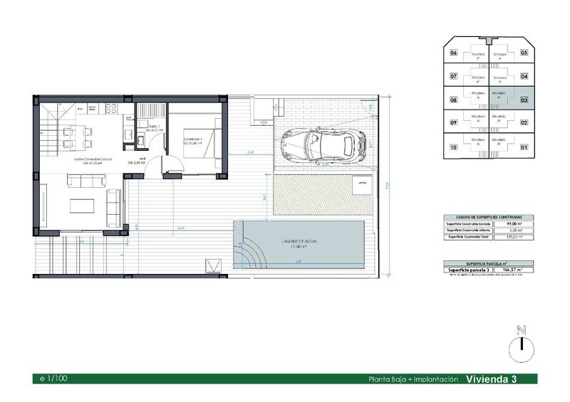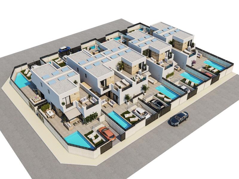 Nybyggeri af 10 semi-datached villaer med 3 soveværelser, 2 badeværelser, åbent køkken med stueområde, indbyggede garderobeskabe, privat have med pool og parkeringsplads.