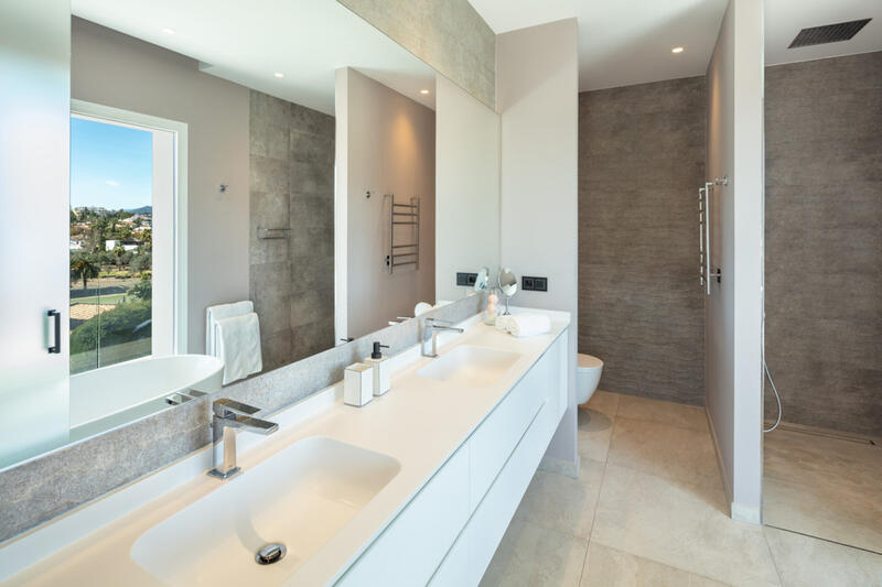This spectacular modern and contemporary style villa has been built using the highest quality materials and finishes, as well as boasting impressive panoramic golf and mountain views.The house is distributed over three floors, and has 5 complete suites, two guest toilets, a very large living room with dining room and fireplace and a designer kitchen perfectly equipped with modern and qualitative furniture and appliances. The entire house is especially bright thanks to the very large windows used to make the most of the hours of light and the sun's rays.We cannot forget to mention its impressive basement, divided into a large garage for two vehicles, a cinema room and a games room.The property is strategically located in one of the best areas of Marbella, known for being especially quiet and safe, and yet only two steps away from the world-famous Puerto Banús.Other important features of this impressive home are its alarm, underfloor heating, independent air conditioning in each room, as well as 24-hour security in the urbanization.Finally, special mention should be made of its outdoor areas, where it has an impressive heated pool, an outdoor dining area and a well-kept garden.