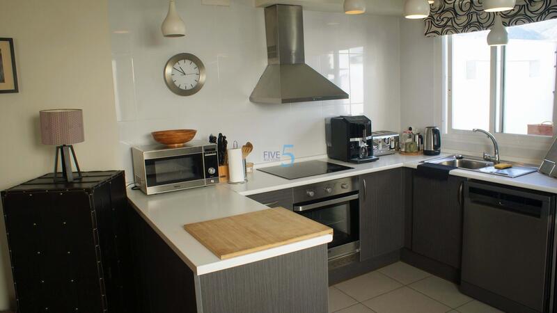 The sleek interior staircase connects to the upper floor, where a modern open-plan kitchen is fitted with the latest appliances. The living and dining areas are bright and spacious, flowing onto the main terrace with panoramic sea views. A second terrace off the kitchen provides picturesque views of the village and surrounding mountains.