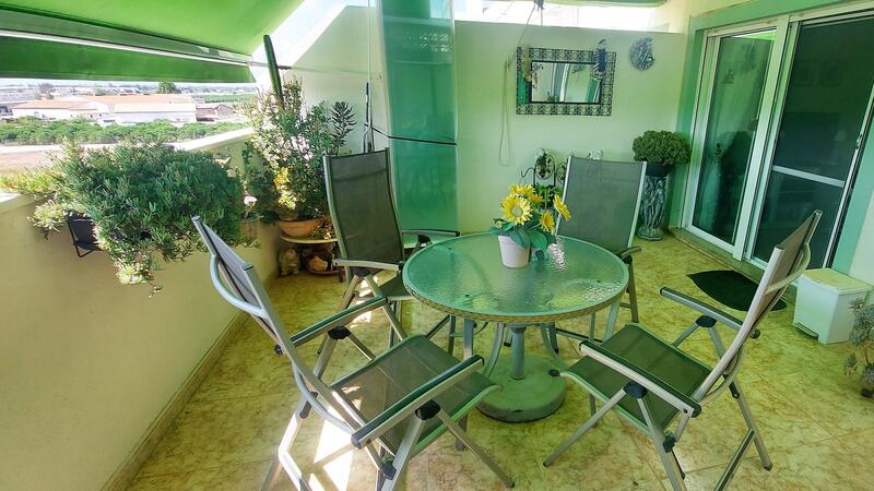 The apartment is a top floor attic penthouse of approximately 60m2 with a gorgeous south-west facing terrace with amazing views across the countryside and agricultural land. The current owners have added beautiful sunblinds as well as glass curtains to make this space an all round area for entertaining or just relaxing and watching the sunset. Inside, the apartment has been very well maintained, the white woodwork and white kitchen cabinets makes the space clean and fresh. The kitchen is fully functional having lots of storage and a cooking hob and a dishwasher with a mini oven and microwave integrated into the utility room where we find the boiler and washing machine. There are 2 bedrooms with fitted wardrobes the main bedroom is next to the fully fitted bathroom and the second one is off the lounge and is currently being used as a hobby room. The roof top solarium has sunbathing area as well as a community swimming pool which also has great views of the surrounding area. This apartment also comes with air-conditioning in the lounge, is being sold fully furnished and comes with a parking space in the underground garage. A truly lovely apartment .