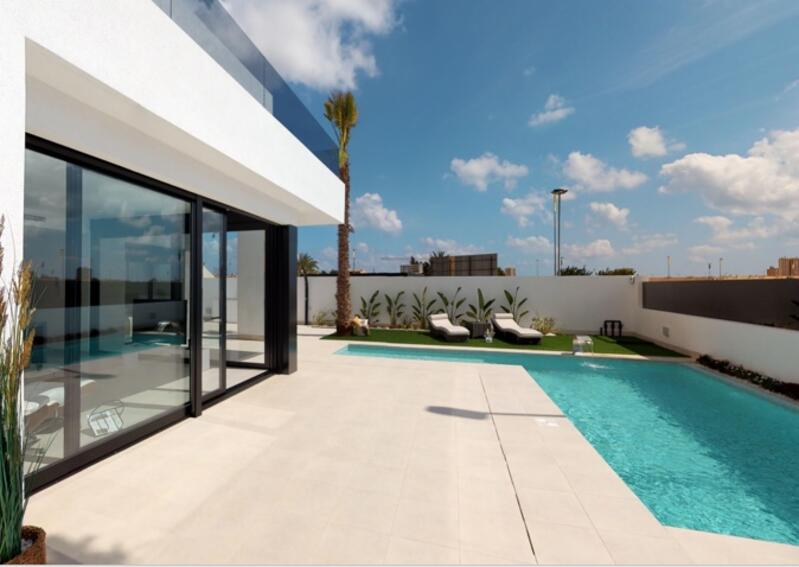 For Sale: Stunning 3 bedroom, 3 bathroom, 115m2 modern villa in San Javier de Murcia. The property has open plan kitchen/living room on the ground floor, 1 bathroom and 1 bedroom. on the first floor there are two more bedrooms, two bathrooms en-suite and access to the private terrace of 14m2, in addition the property there is a garden and private pool.