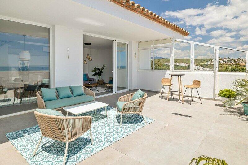 Spacious living/dining area with open plan fully fitted kitchen with Bosch appliances and direct access to a big covered and open terrace with amazing views. Guest toilet.