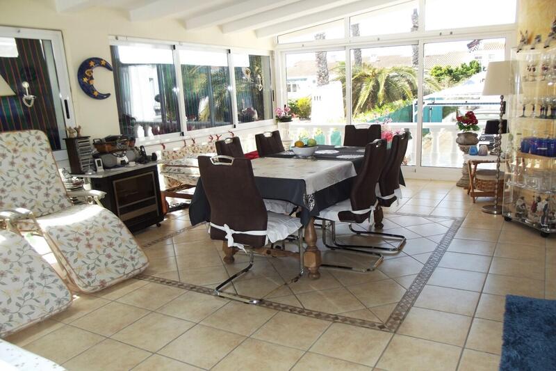 The villa has all rooms on one floor and has a spacious living room with fireplace, an American kitchen with a door to the glazed-in terrace with sitting and dining area, 3 bedrooms and 1 bathroom. In the basement of this house we find a guest house with a living space, a bedroom and a bathroom. Sold furnished. A/C.