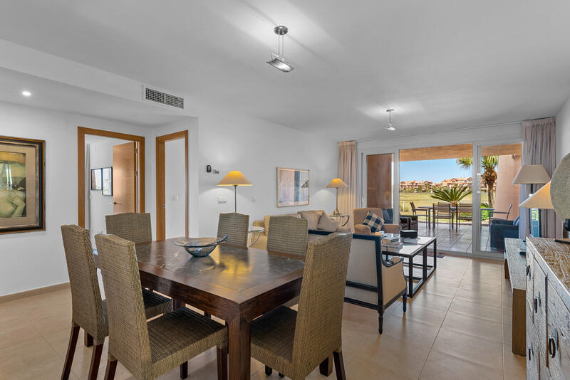 This ground floor apartment is located in an almost paradisiacal environment!A beautiful project on the Mar Menor Golf Resort in Murcia.There are several swimming pools, a restaurant, a golf course and beautifully landscaped gardens/terraces for free use.An underground parking space is included in the price.The layout of the apartment is as follows:Entrance with bright living room with access to the private terrace with open views of the grounds with beautifully landscaped gardens with golf and swimming facilities. A semi-open fully equipped kitchen, 2 bathrooms, 3 spacious bedrooms with fitted wardrobes and each with their terraces!Here you can completely relax!EXTREMELY CAREFUL AND CLEAN ENVIRONMENT! INSTANT HOLIDAY FEELS!FURNITURE INCLUDED IN THE PRICE! (excluding works of art and paintings)GREAT OPPORTUNITY!!!!!+/- €180/month common costs
