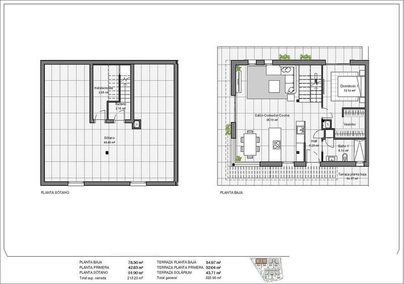 Modern properties with 3 spacious bedrooms with built-in wardrobes (the main one on the ground floor, with bathroom and dressing room en suite), 2 spacious bathrooms, large living-dining room with open kitchen, spacious terraces, large semi-basement with windows.