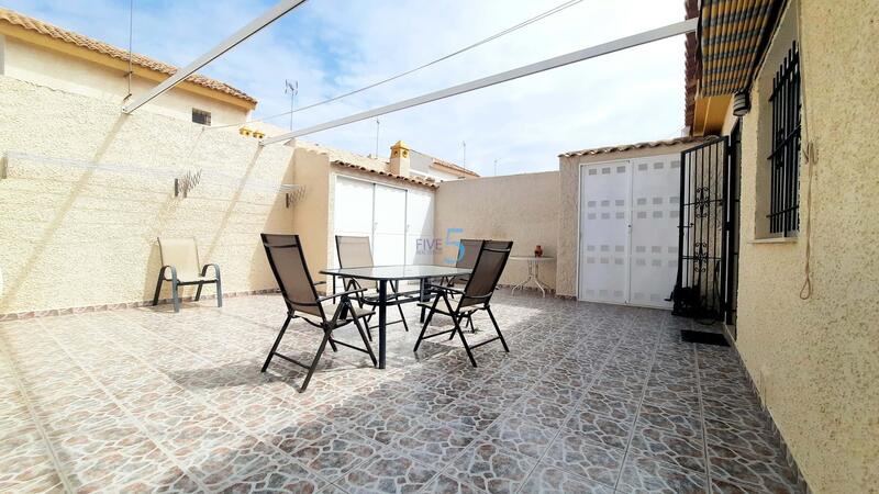 Through the front door leads you into a living room with dining area. The house has gas central heating so perfect for colder winter mornings/evenings. Off the living room is a ground floor double bedroom with fitted wardrobes, a modern shower room/toilet and a separate modern fully fitted kitchen with plenty of work space and storage space. There's a door from the kitchen leading to another large rear terrace with storage shed and aluminium cupboards for the washing machine etc and the other cupboard space houses the air conditioning units. This terrace is also large so the house provided amazing outdoor living spaces and great when friends and family visit as they have separate areas to go to should this be needed and it has an awning to provide shade when required.