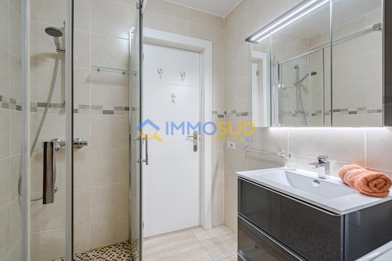 Er is zon op het terras vanaf de ochtend in de zomer en vanaf de middag in de winter. Verkocht semi-gemeubileerd.