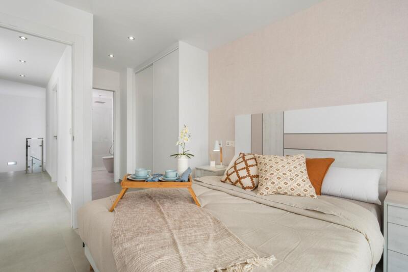 3 Bed 3 Bath New Build Detached Villas in La Marina with Private Pool. These stunning pieces of architecture are new build villas Residencial Mykonos Santorini. Located in La Marina Urbanization, consisting of 3 bedrooms and 3 bathrooms. Being finished in 2023. The residential consists of 23 Ibiza style detached villas in independent plots with terrace, parking space and a 6x3 private swimming pool provided with filter equipment, programmer, two underwater lights and shower. They all have double glazing throughout, Electric shutters in bedrooms, electric hob and extractor fan in the kitchen, full finished bathrooms, pre-installed ducted air-conditioning and inside and outside illumination. A brief description of the property: They comprise a large living area with easy to slide glazed windows to access the front garden. Fitted kitchen with top and bottom built in units and space for integrated white goods. The kitchen island unit with bar facing the living room. 3 bedrooms with sliding wardrobes. The master bedroom comes with folding wardrobes and a private balcony/terrace. 3 bathrooms with suspended sinks, one en-suite. All houses are carefully designed with high quality materials to satisfy the needs of the most discerning clients Mykonos – 2 floors with option roof solarium Santorini – 1 floor bungalow with optional roof solarium A prestigious area on the Costa Blanca, surrounded by nature and very close to all amenities. Its located 20 min from Alicante airport, near the beautiful beaches of Guardamar and only 2 km from extraordinary golf courses. Its excellent location makes the residential a perfect choice for those who search for a calm environment.