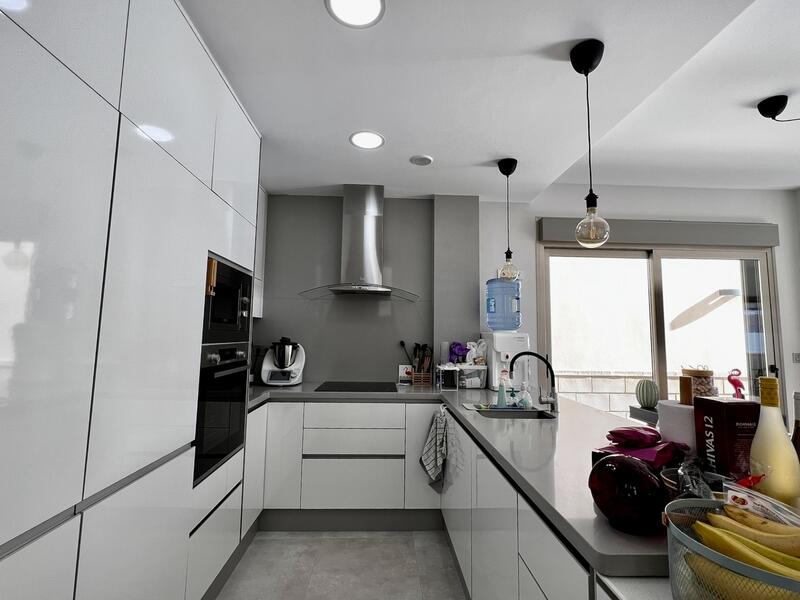 We are pleased to present to you this modern detached villa in the popular and growing area Villamartin on the Orihuela Costa. The house was built in 2018 using modern technology and is fully equipped with everything necessary for permanent residence. The lower floor of the house is a spacious living room, open plan kitchen, bedroom with access to the pool area and bathroom. Upstairs you will find 2 more double bedrooms and 1 bathroom. From the solarium we have a view of the green area and the pink salt lake of Torrevieja.