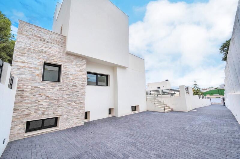 Built in 2021 this stunning villa sits on a huge 520m2 fully landscaped plot with private swimming pool. The thoughtfully designed villa has been built across 3 levels plus the solarium. The ground floor of the property comprises of the living and dining room with the open plan slick kitchen situated towards the rear of the room with independent laundry and utility room with direct access outside of the villa to the terrace and garden. You will also find one bedroom and one guest bathroom. An internal leads upstairs where you will find two master bedrooms both with en-suite bathrooms and access to private sun terraces. The property also boasts a fully equipped basement which also provides 2 additional bedrooms and 2 bathrooms. The villa is located in the sought after location Los Balcones just minutes from the famous salt lakes and Mediterranean sea - views can be enjoyed from the solarium.