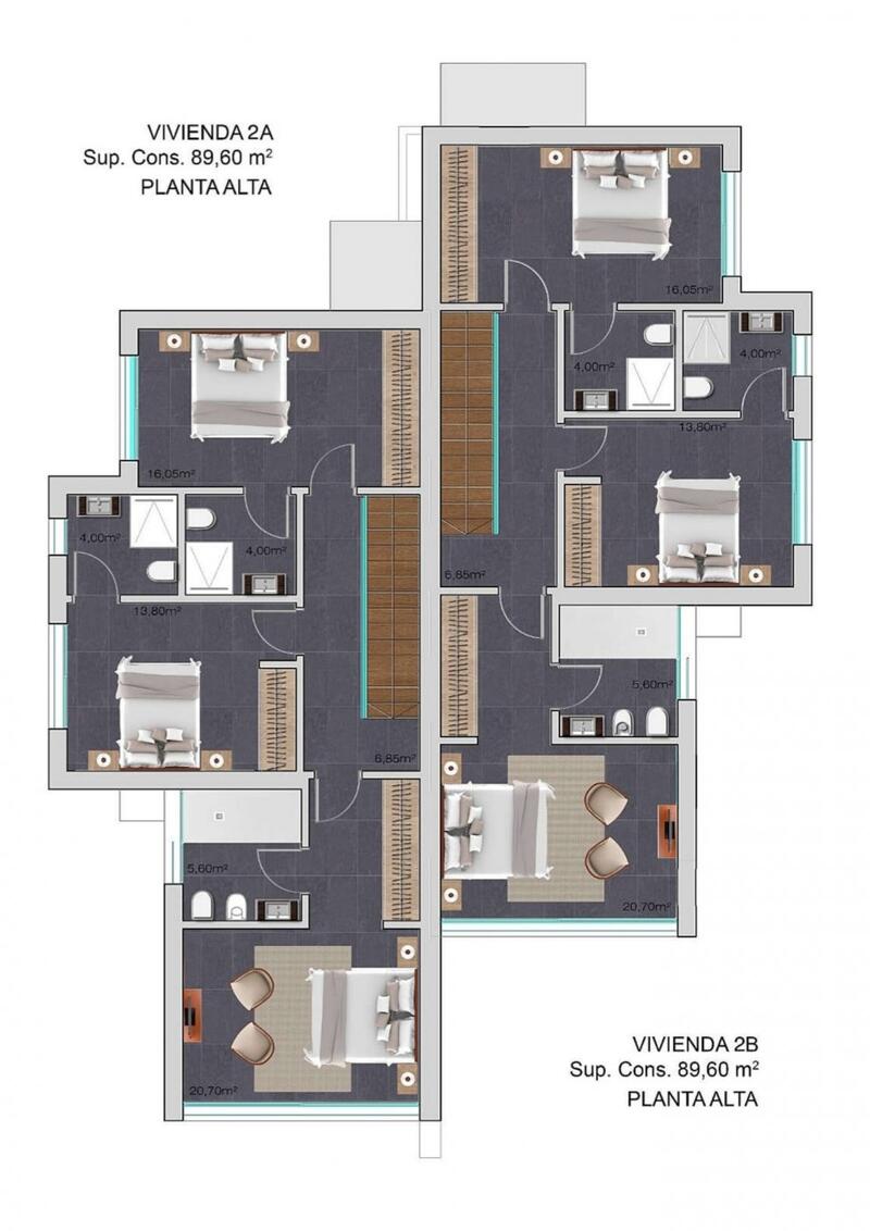 Villaene har 3 soverom, alle med eget bad pluss et gjestetoalett, og er innredet med luksuriøs finish, inkludert aerotermisk klimaanlegg, med gulvvarme og kanalisert klimaanlegg, luksuskjøkken med alle hvitevarer inkludert, porselen i stort format gulvbelegg, herunder detaljer på byggets fasade, baderomsmøbler, vegghengte kraner, lakkerte dører med skjulte hengsler og magnetisk lukking, utvendig snekring av merket Technal m.m.
