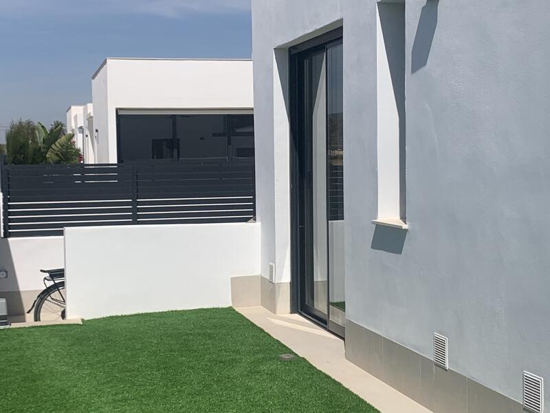 We are delighted to offer exclusively this stunning villa which is almost new and only 500 metres to the beach. The property is only 12 months old and sadly the owners are relocating due to unforeseen circumstances. The owners have added many extras from the original build. The property is L shaped, has 3 bedrooms and 2 bathrooms, a beautiful open plan living area, a huge solarium and a large front south facing terrace where you find the pool and a rear north facing terrace for a cooler dining area for those hot summer nights. Recently reduced for a quick sale and will include furniture