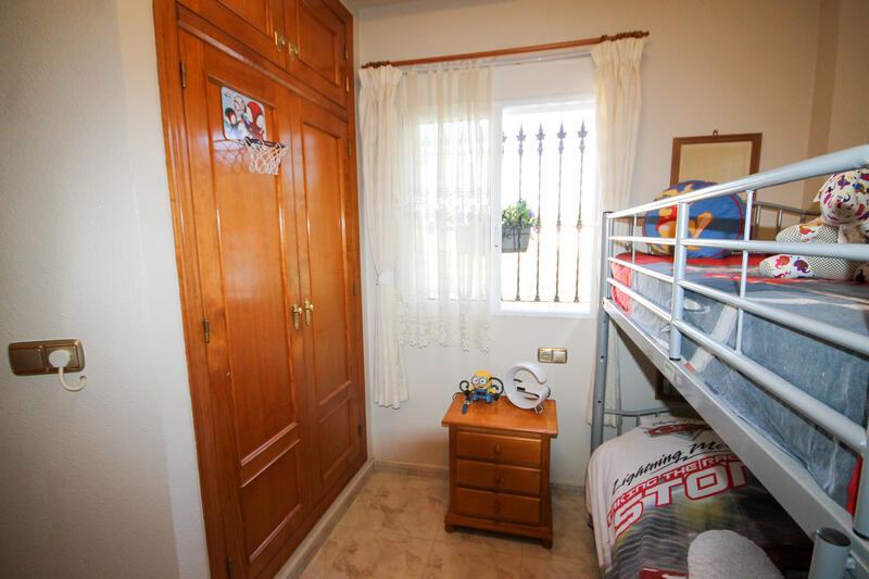 The 500m2 plot boasts a beautiful pool area with new tiling and a fabulous new outdoor kitchen featuring a pizza oven. There are also areas to sit and relax in this lovely, tranquil landscaped garden which also includes fruit trees. The villa is entered via a large terrace overlooking the pool and garden. This leads into the lounge diner with the spacious kitchen and utility area adjacent. Just off the lounge is the family bathroom and three double bedrooms with fitted wardrobes, the master having an en-suite shower room. Spiral stairs lead up to the roof solarium with a small storage cupboard. The stairs also access the very spacious garage which offers the possibility of more accommodation if needed. The villa also benefits from an alarm, air conditioning, internet, a communal pool as well as the private pool which has new coloured LED lights. To be sold part furnished. The villa is a short walk to bars and restaurants, including Villamartin Plaza. The fabulous blue flag beaches of the Orihuela Costa are only 8 minutes drive away.nbsp; Suma (IBI) 475€,nbsp; Community fees: 180€ pa