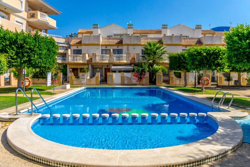 The flat is located in Dehesa de Campoamor. The famous Cabo Roig beach with its white sandy beaches is within walking distance. Here you can participate in various water sports such as sailing, jet skiing, diving or family boat trips that are very popular in this coastal area with its own marina. The so-called winter beach is really a hit in the winter months. At the front of the complex is the strip, with all its bars, shops and restaurants. Alicante Airport is a 40-minute drive away.The flat has 2 bedrooms and 1 bathroom. A living room with open kitchen which leads to a large terrace. There is a communal pool and underground parking.The flat is sold furnished and is available immediately. Communal costs: €300/quarterIBI: €193