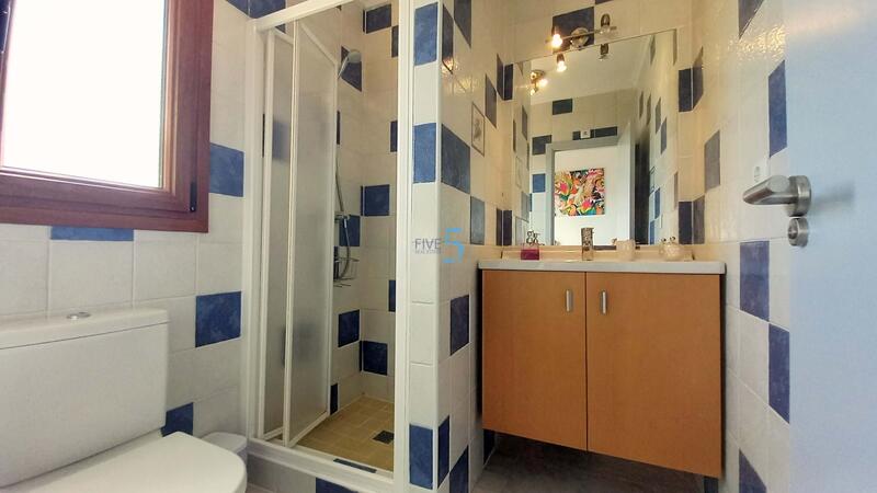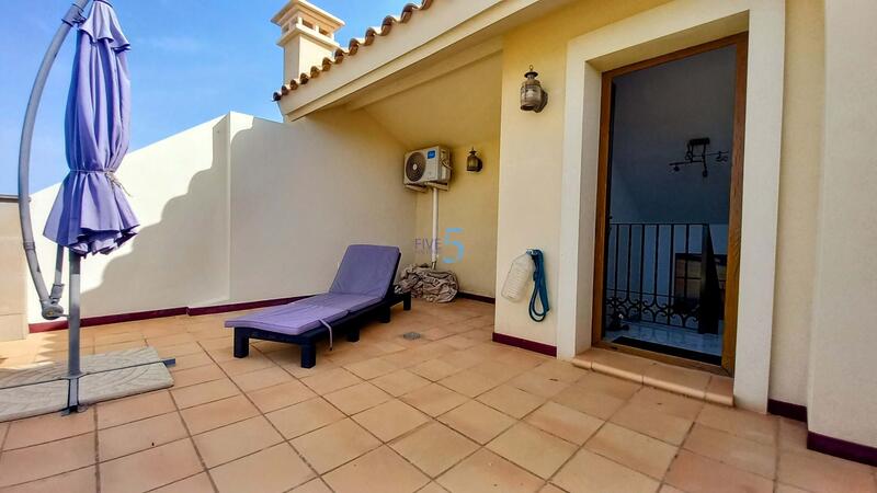 The upper floor houses two double bedrooms, both equipped with air conditioning, fitted wardrobes, and ensuite shower rooms, ensuring comfort and privacy. The rooftop solarium provides a private retreat with panoramic views of the golf course and mountains.