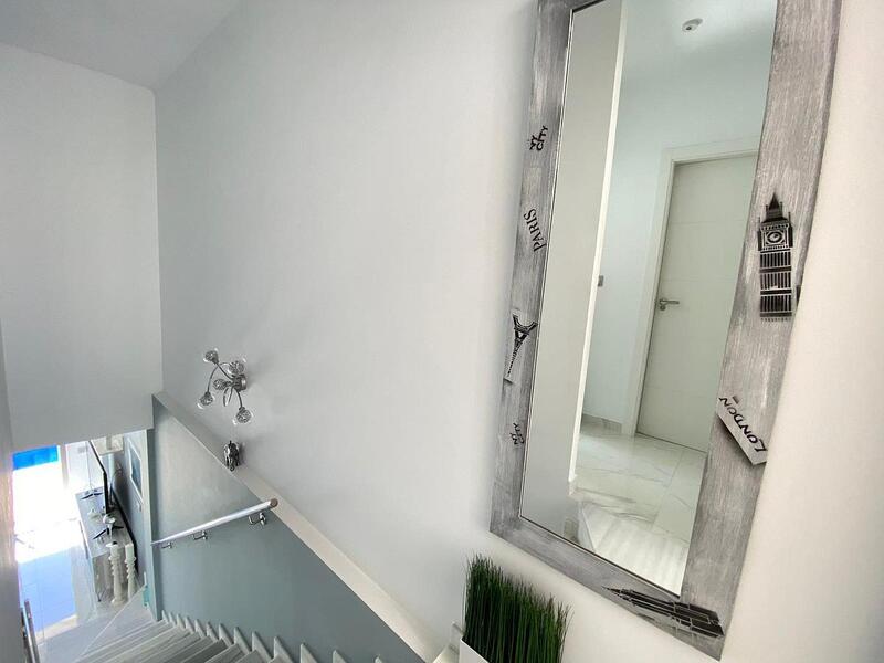 South Facing villa within walking distance of the beach and town. This resale modern detached villa is only a short walk to the spectacular beaches of Los Alcazares, the old town and also the 525 strip with plenty of bars and restaurants. On the ground floor there is an open plan lounge/dining/kitchen area, a double bedroom with access to the rear terrace where utility area is located with aerothermin boiler and washing machine, downstairs bathroom with walk in shower, wardrobe space. Stairs lead up to two double bedrooms, the master bedroom with access to a sun terrace, sharing bathroom with walk in shower, stairs lead up to private roof solarium with sitting/dining area with outdoor kitchen & bar with the sun all day. The garden is tiled throughout with a private swimming pool. Underground communal car park space and private storage room.