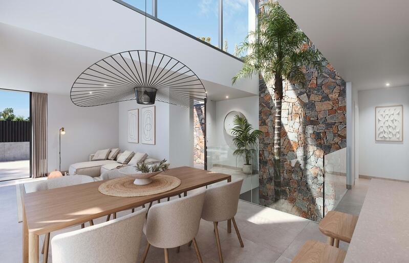 Each villa is thoughtfully designed across three floors, providing ample space and a comfortable layout. With 3 bedrooms, 2 bathrooms, and an additional guest toilet, these homes are ideal for families and couples alike. The open-plan kitchen flows seamlessly into the dining and living areas, creating a bright, airy atmosphere. Key features include fitted wardrobes, a private basement, solarium, and a private garden with a swimming pool and parking space. Enjoy panoramic views and the beautiful Murcia climate from the solarium, which is pre-fitted for an outdoor kitchen, jacuzzi, and solar panels.