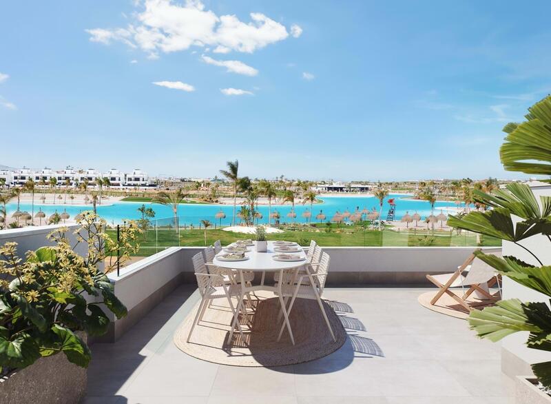 This exclusive gated resort is designed around a vast 126,000 m² green space, offering walking and cycling paths, sports facilities, paddle and tennis courts, a mini-golf course, dog parks, and leisure areas. At the heart of the resort is an impressive 17,000 m² crystal-clear lake with white sandy beaches, evoking a Caribbean ambiance in the heart of Murcia. Two islands within the lake feature a bar and beach chiringuitos for a relaxing retreat close to home.