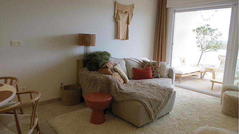 The apartment itself is on the first floor and can be reached by stairs or lift. Upon entering, you are welcomed by a spacious living room with an open kitchen. From the living room, you have access to the cosy terrace with a view over the communal garden of the urbanisation.
