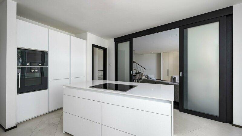 The main level features a bright living room with panoramic glass doors, a guest toilet, and a laundry room connected to a sleek, minimalist-style kitchen with a fashionable central island/bar and premium equipment with access to the beautiful main terrace. A contemporary staircase with metal railing brings you to the second level, to the spacious master bedroom with an en-suite bathroom and a private terrace. On this level, there is also an additional bedroom with a bathroom and access to a large terrace. On the basement level you have direct access to the private garage with two parking spots and a large storage.