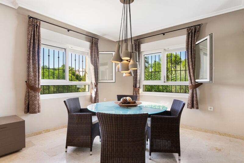 The villa stands on a plot of 747m2 with various sitting and sun areas, a heated private swimming pool, a fully-fitted outdoor kitchen with barbecue, a lawn with artificial grass and driveway for several cars.