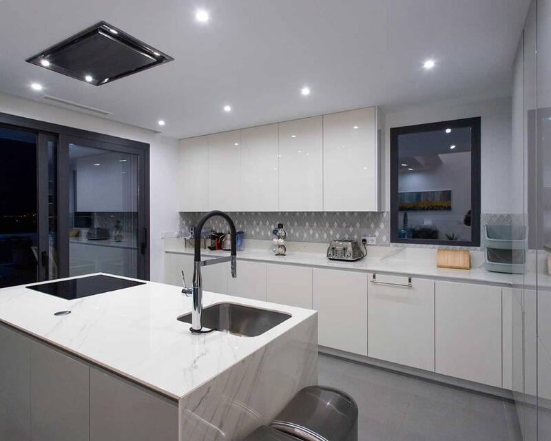 Located on the upper floor there are 2 bedrooms, the main bedroom which has a large American size dream bed, large LED TV, walk-in wardrobes, an en-suite bathroom with walk-in shower and a private balcony which boasts some magnificent views of the coast. The second bedroom has a super king size bed with it's own tv, en-suite bathroom and glossy white flush wardrobes.