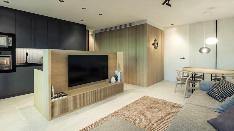 Moderna lägenheter med en byggnadsstorlek på drygt 80 kvadratmeter och med ett öppet vardagsrum/matsal och ett fullt utrustat kök. Köket är konstruerat i en rak linje med hållbara material med en kompakt bänkskiva i kvarts och blandningskranar med lågt flöde vilket minskar vattenförbrukningen, och levereras fullt utrustat med en integrerad fläktkåpa, elektrisk ugn, mikrovågsugn, induktionshäll, tvättmaskin, diskmaskin och kylskåp. Dessutom 2 rymliga sovrum, 2 kompletta badrum och en privat terrass/balkon med fenomenal havsutsikt.