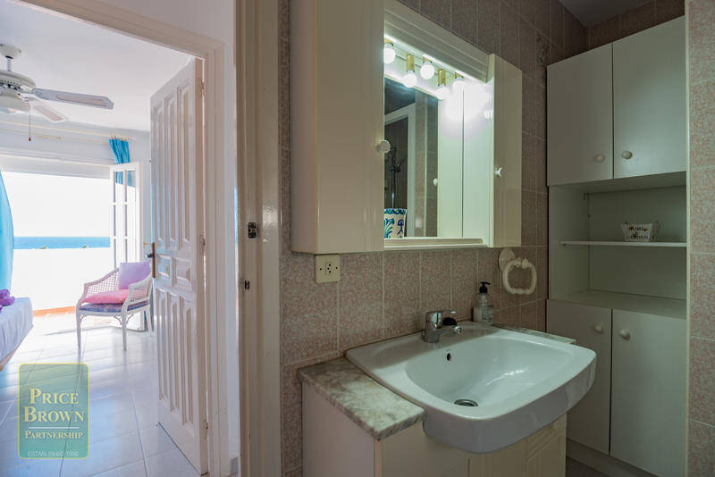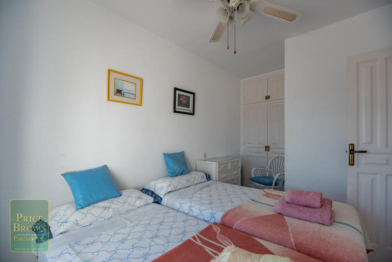 Lovely ground floor apartment in two levels in Alameda complex, the street level compromises: a double bedroom with built in wardrobe, balcony with sea views and air con, a second bedroom with built in wardrobe, balcony with sea views and ceiling fan and a bathroom with shower, steps leads to the lower level with a light and airy lounge dining area with patio doors giving access to the terrace with sea views and air conditioning, open plan and well fitted kitchen, single bedroom with sea views and built in wardrobe and a bathroom with a shower. Close to all amenities.
