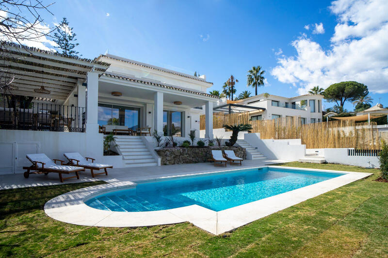 ¡¡¡2023 NEWLY RENOVATED DETACHED VILLA IN NUEVA ANDALUCÍA!!!Villa in Las Brisas, Nueva Andalucia with super views to La Concha and the Golf Course. Private Garden Plot with Pool in perfect condition.5 Bedrooms in total, 2 main master bedrooms both on-suite one with private terrace with panoramic views, 2 bedrooms on the ground floor and 1 extra in separate private apartment with bathroom.Solar Panels included in price.