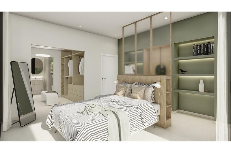 The project comprises detached villas with 3 bedrooms and 3 bathrooms, distributed on two floors plus a basement, built on plots between 383m2-549m2. The ground floor presents a spacious living area, combining the lounge, dining area, and kitchen with island in a single space. The large windows in the lounge allow a lot of natural light in, creating a bright interior space. These windows can be completely retracted, creating a natural extension of the lounge onto the pergola covered terrace and infinity pool area. There is a guest toilet and a double bedroom with private bathroom on this floor too. The remaining 2 bedrooms are on the first floor, both with a private bathroom and a terrace. One of these bedrooms also has a private dressing room. The basement is divided into an underground garage, a laundry, and an impressive 67m2 multipurpose space. Depending on the stage of construction, and for an additional price, it is possible to customise the basement as required, eg. games room, home cinema, bodega, and/or an extra lounge area.