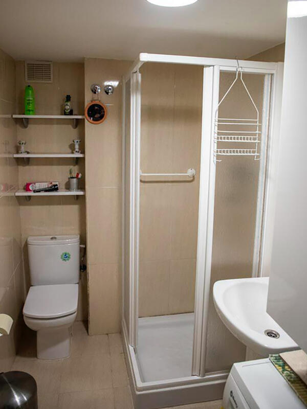 Den nedre våningen nås genom att gå tillbaka in i entrélobbyn och ner för trappan. Denna våning har ett andra duschrum och ett stort öppet rum som kan vara ett tredje sovrum med ett eget duschrum. Samhällsavgifterna för denna lägenhet är 120 € i månaden. Det finns bara sex lägenheter i kvarteret och det är väldigt tyst.