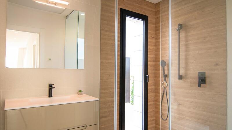 On the first floor there is another bedroom, a family bathroom & the master bedroom with an en-suite bathroom providing access to the solarium of 30 m2, overlooking the private terrace, garden, swimming pool & the surrounding area including the salt lake in Torrevieja, & the natural lagoon.