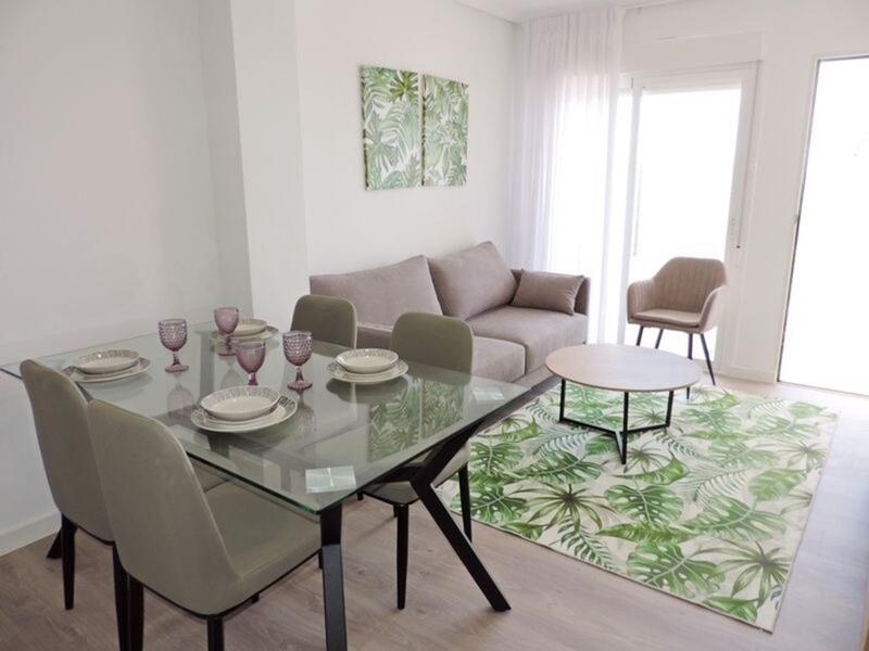 Santa Rosalía is a small village located next to the best golf courses and beaches of Los Alcázares. It lies within a triangle formed by Roda Golf, Mar Menor Golf and Los Alcázares.Within Santa Rosalía we can find all the necessary services such as a supermarket, bars and a great restaurant called La Almazara.The urbanization consists of 3 blocks of houses with a communal pool and sports area. The house has a dining/living area, kitchen, two bedrooms and a solarium where you can enjoy the wonderful sun. The house is fully completed with furniture, air conditioning, kitchen with all appliances, lighting, furniture in the bathrooms, screen, wooden floor and laundry room in solarium with thermos and washing machine.Come and see this property soon
