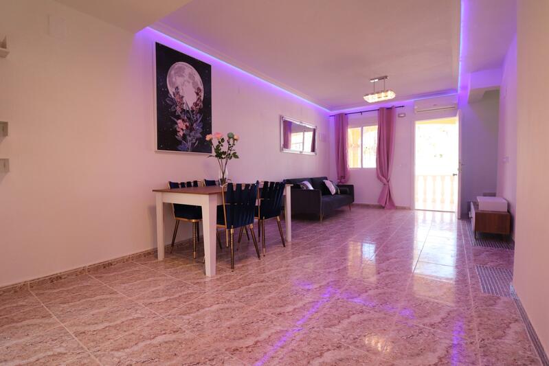 This Updated Modernized, Three Bedroom Townhouse in Villamartin is located in the area of Blue Lagoon, in The Orihuela Costa. Situated a minutes drive or a short walk to the nearest amenities either at La Fuente Commercial Centre or Villamartin Plaza. Beaches and many golf courses are also within a 5 minutes drive! This fantastic property comprises on the ground floor of a modern, separate fully fitted kitchen, with breakfast bar a rear door to the South facing courtyard and Utility area; a spacious lounge/dining room with access out to the front, covered terrace tiled low maintenance garden; a cloakroom; a double bedroom; and a shower room. On the first floor, there a further two double bedrooms, both with a private terrace, one of which benefiting from direct, South facing views, over the communal gardens, swimming pool and distant sea! Back door from the rear courtyard leads out directly to the communal gardens and swimming pool. Extras are to include fitted wardrobes in two of the bedrooms, air conditioning in the living room, some window grills, white goods and furniture!