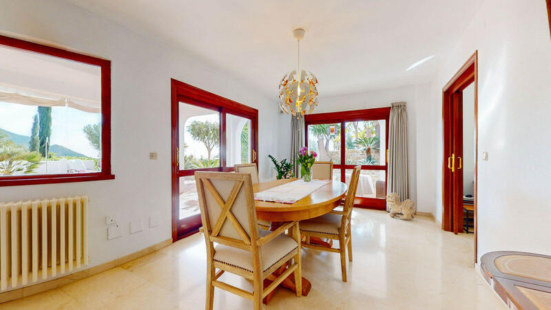 To the left, a light-flooded dining room leads into an open living room landscape with chimney and TV. From all rooms you have a fantastic view of the terrace, the pool and the wonderfully landscaped garden. In the large fully equipped kitchen with cooking island, there is a great panoramic view of the mountains of Mijas.