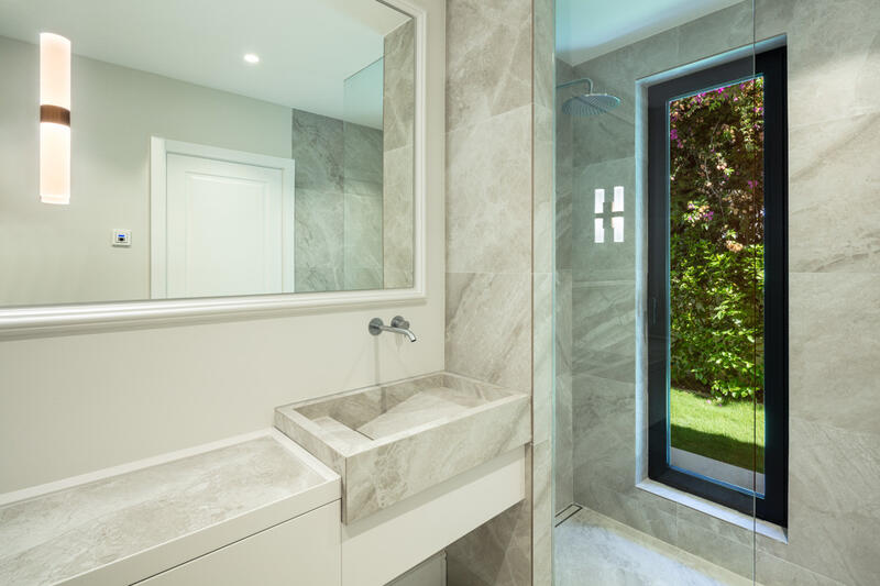 The master bathroom boasts a stunning double vanity, walk-in shower and bathtub adorned with the same exquisite marble featured in the kitchen. Situated on an ample plot in the sought- after area of Aloha, the villa offers breathtaking views of La Concha mountain and convenient access to a wealth of amenities within Nueva Andalucia's Golf Valley.