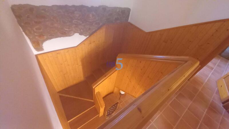 We enter the front door, and today we use this one to enter the open plan living dining room area. This is a wonderful space with traditional arched windows and shutters, beamed ceilings, and a log burner. The lounge flows through to the country style kitchen which is fitted with appliances including gas hob, electric oven, and fridge freezer. From the kitchen we find a long hallway with 2 bedrooms currently used as storage rooms and an amazing large naya with arched doors that open up onto the pool. Also on this floor is a bathroom and separate WC.