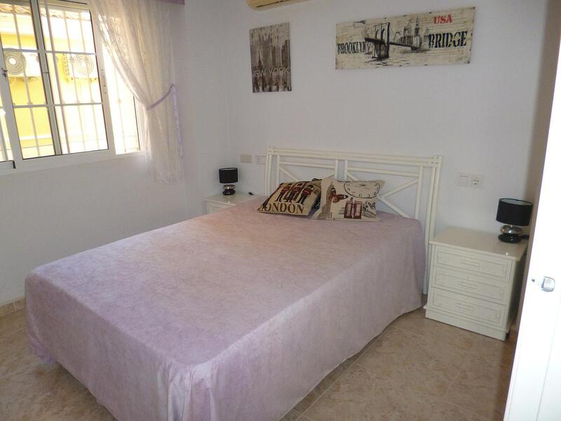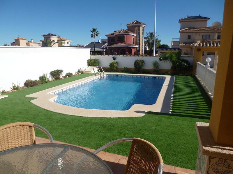 A beautiful spacious south facing villa in la Zenia. 156m2 interior and a 500m2 building plot, 4 spacious bedrooms with fitted wardrobes two family bathrooms, one with a bath the other with a walk in shower. The property benefits from air conditioning, music speakers throughout, fibre optic internet, alarm and security grills. A large private swimming pool to the front of the property with a car port and off street parking. A sun terrace from the living room to the pool. To the rear of the Villa is a storage shed, table and chairs seating area for afternoon / evening sun. The utility room is also situated to the rear of the property. The garden has an automatic watering system and well maintained garden.Entrance via the front door to the spacious hallway stairs to 1st floor and storage cupboard. The living room with log burner fireplace is open plan to the dining area and American style modern fitted kitchen. Two double bedrooms on the ground floor and a large bathroom with walk in shower. On the 1st floor landing is a storage cupboard and two more double bedrooms and another family bathroom with a bath. The landing and patio doors from the master bedroom lead to the sun balcony with views overlooking the swimming pool and garden.