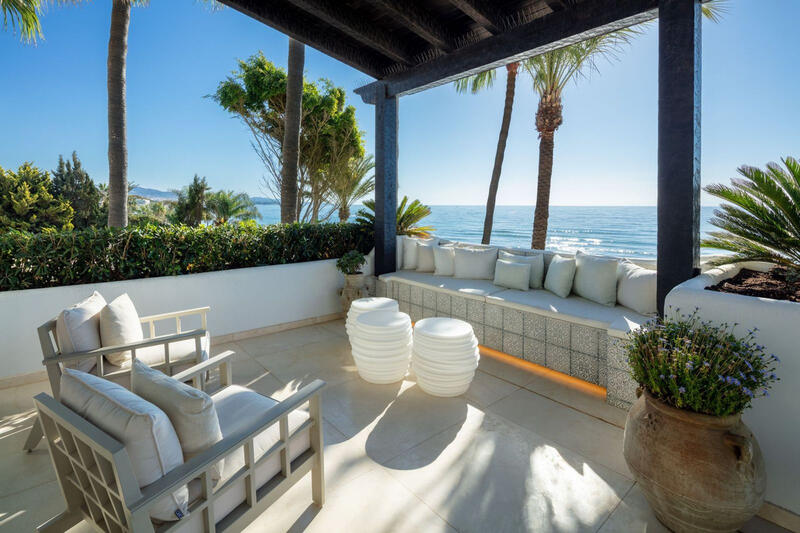 A stunning duplex apartment positioned in a highly sought-after frontline beach location within the prestigious Puente Romano Resort. This exceptional property boasts breathtaking panoramic sea views, overlooking the community garden and our beloved coastline. It's southern orientation ensures that natural sunlight bathes the residence throughout the day, creating unparalleled sunrises and sunsets. The apartment offers an abundance of terrace space, ideal for al-fresco dining and chill-out areas, catering to those who appreciate the outdoor lifestyle. The ground level of the property maximises the use of its outdoor spaces, allowing direct terrace access from all areas through floor-to-ceiling glass sliding doors. The interior of the property is truly astonishing, elegantly adorned with neutral tones and hints of blue, mirroring the colours observed when gazing out towards the terrace and sea. The colour palette evokes a sense of tranquillity, while the layout provides both functionality and style. The living area is a true masterpiece, featuring an integrated bookshelf, a sophisticated bar and a cosy fireplace, seamlessly connecting to the dining area and kitchen. The kitchen combines practicality and aesthetics, showcasing a stunning kitchen island embellished with exquisite marble and equipped with state-of-the-art appliances and a wine fridge. The two guest bedrooms, situated on the ground floor, boast impeccable interior design and en-suite bathrooms. The upper level of the property is dedicated to the opulent master bedroom. With its own private living area complete with a fireplace, the master bedroom offers an elegant walk-in closet, a spacious en-suite bathroom and an incredible private terrace that opens up to the entire master suite. The master terrace not only provides stunning views and a serene chill-out area but also features a captivating pool overlooking the glistening sea. With its exceptional location, luxurious interiors and generous terraces, this property presents a remarkable opportunity to indulge in Marbella's prestigious beachside lifestyle.