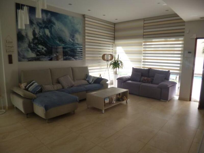 A lovely new 4 bedroom 4 bathroom, modern style south facing villa with its own pool. The property is situated in Villamartin and has off street parking to the front of its 330m2 plot. The private swimming pool is salt water so easy to maintain with quality astro turf to look like grass. The property is different to standard with alterations to maximize the space. The living room is open plan to the large modern fitted kitchen which has a exit door to the side which leads to the BBQ area and the door to the rear takes you to the under build or the solarium of 120m2 which has views of the salt lakes. To the side of the kitchen is a dining area or study. Two bedrooms on this floor with 2 bathrooms the master having a walk in wardrobe and en-suite with a floating bed and under lighting. Downstairs is a large under build with two more bedrooms and two bathrooms, another living room / cinema room and dining space. A separate kitchen / utility room. The property also integral air conditioning for cold or hot air and electric window security blinds which can be all closed from one switch, viewing highly recommended.