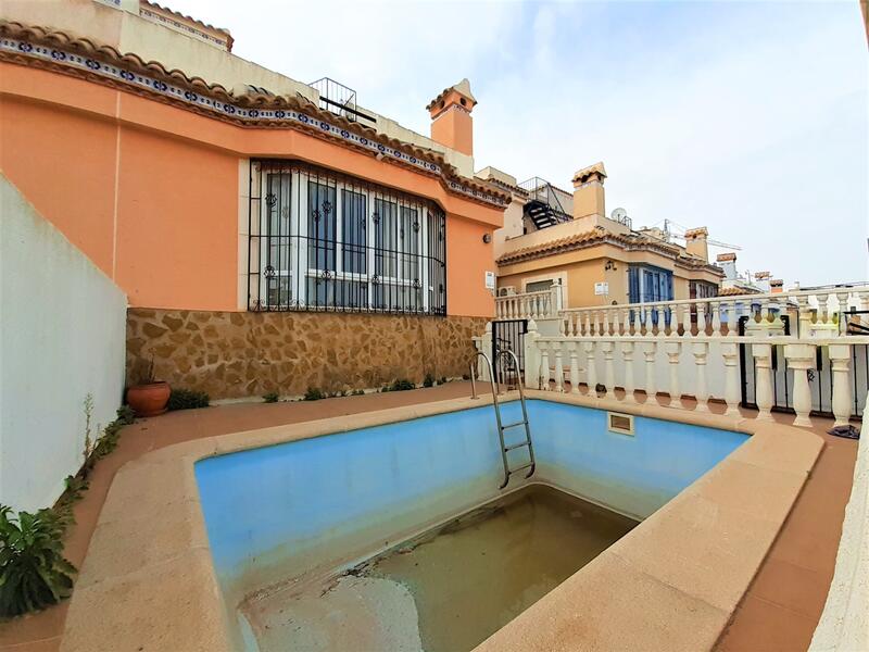 Semi-detached villa with private swimming pool for sale in Villamartín - Orihuela Costa. The property offers a 114 sqm built surface with private pool, 3 bedrooms and 2 bathrooms. On the outside there is private swimming pool, a patio and a small garden with off road parking.